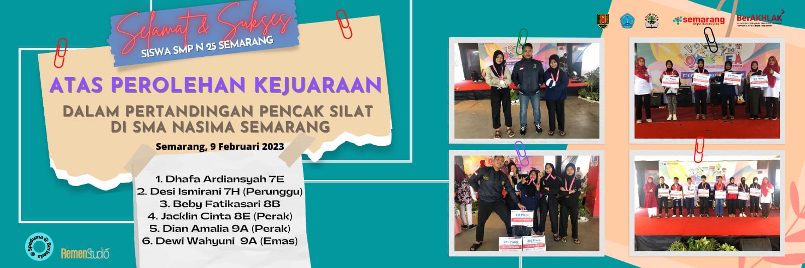 Ajang unjuk gigi pesilat pemula ini diselenggarakan di SMA Nasima, Kota Semarang, Kamis (9/2/2023). Dalam ajang tersebut, 6 atlet SMP Negeri 25 Semarang berhasil mengumpulkan 4 medali yang terdiri atas satu emas, dua perak, dan satu perunggu.